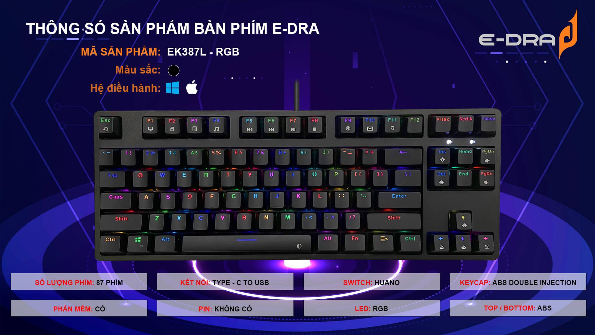 Trước đây, bàn phím cơ chất lượng tốt thường có giá cao, khó mua. Nhưng hiện nay, các hãng sản xuất thiết bị chơi game đã giảm giá thành đáng kể, giúp người dùng dễ tiếp cận hơn. E-DRA, một thương hiệu Việt Nam nổi bật trong xu hướng này, đã cho ra mắt bàn phím cơ E-DRA EK387L RGB với giá cả phải chăng và hiệu năng tốt. Sản phẩm này kế thừa thành công của các thế hệ trước, được cải tiến đáng kể, hứa hẹn sẽ trở thành một sản phẩm bàn phím cơ tầm trung phổ biến. E-DRA EK387L RGB được nâng cấp về chất lượng hoàn thiện.