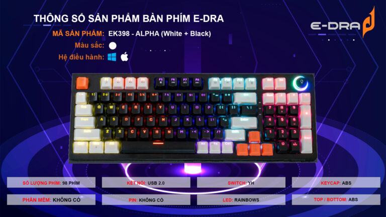 Bàn phím E-Dra EK398 sử dụng Switch YH, loại switch chất lượng cao giúp người dùng thao tác mượt mà với phản hồi nhanh chóng. Với ba tùy chọn switch Blue, Red và Brown, bạn có thể chọn loại phù hợp với nhu cầu của mình. Keycap được làm từ chất liệu ABS bền chắc, đảm bảo tuổi thọ lâu dài cho bàn phím.