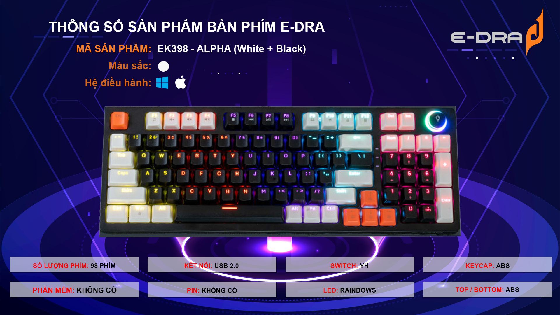 Bàn phím E-Dra EK398 được thiết kế với layout Alpha gồm 98 phím, là phiên bản rút gọn so với bàn phím fullsize, nhưng vẫn bao gồm cả phím số mà các mẫu TKL thiếu. Layout này vừa nhỏ gọn lại vẫn đầy đủ các phím chức năng cần thiết cho cả game thủ và người làm văn phòng.