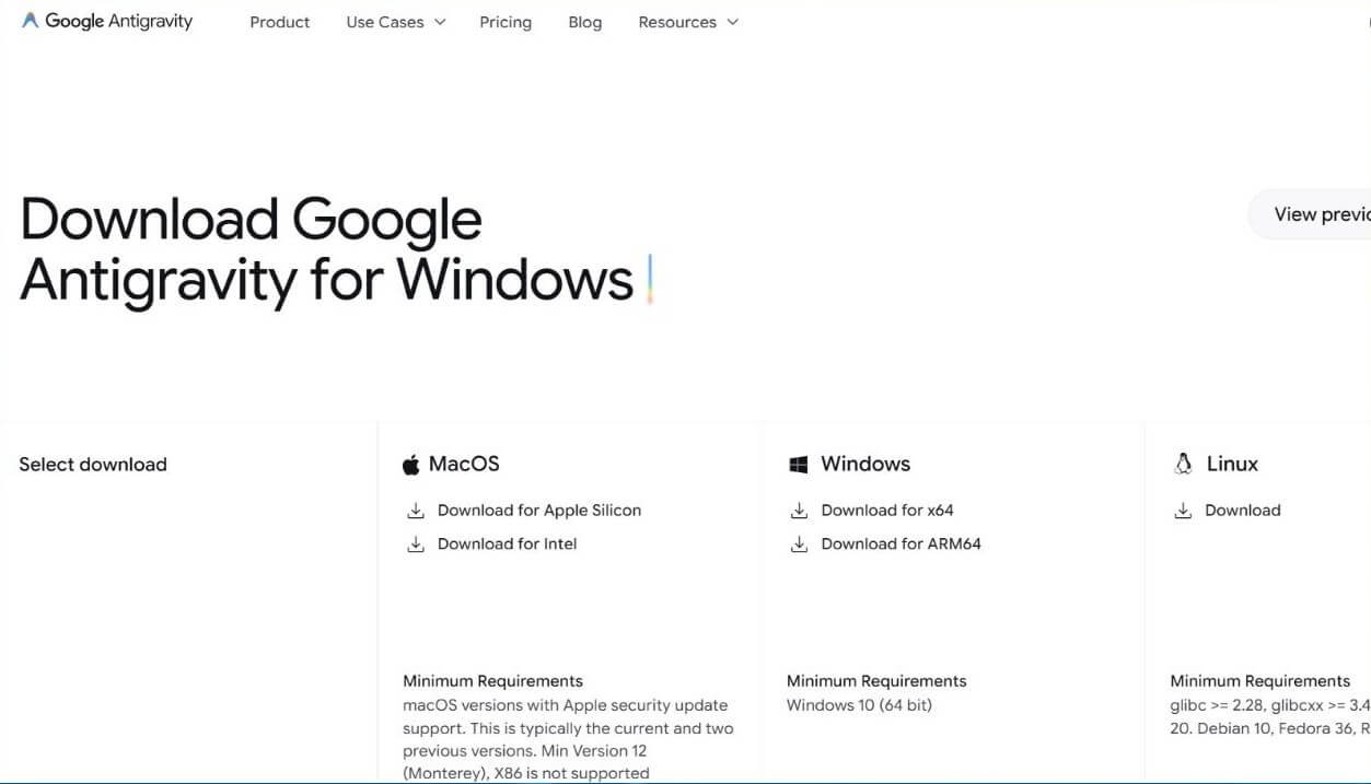 Truy cập vào trang tải Google Antigravity và chọn phiên bản phù hợp với hệ điều hành của bạn (Windows, macOS hoặc Linux).