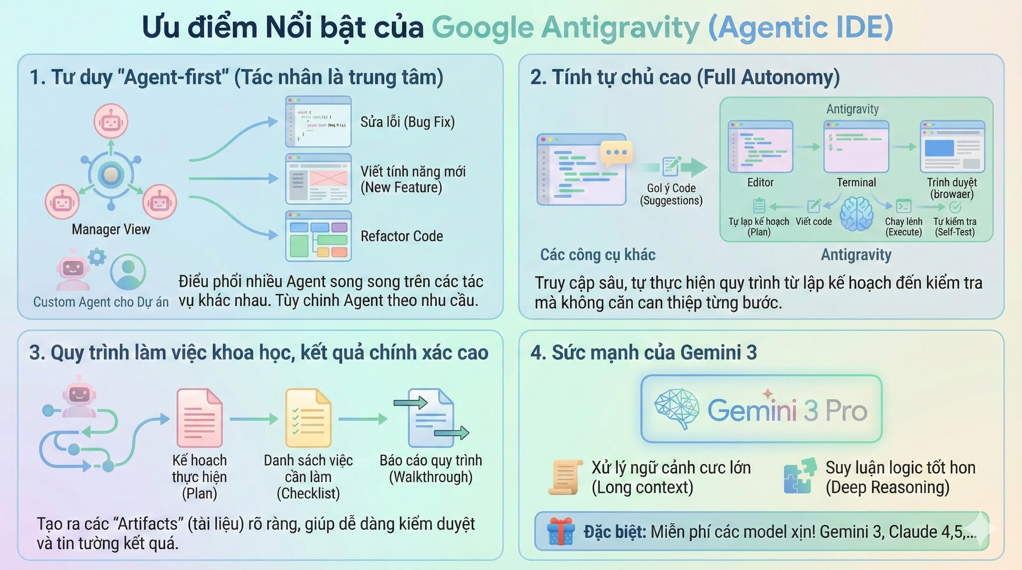 Thay vì chỉ gợi ý hoặc hỗ trợ viết code như các công cụ AI thế hệ trước, Antigravity sử dụng các tác nhân AI tự chủ vận hành trên mô hình Gemini 3 Pro, cho phép người dùng giao toàn bộ nhiệm vụ lập trình cho AI xử lý.