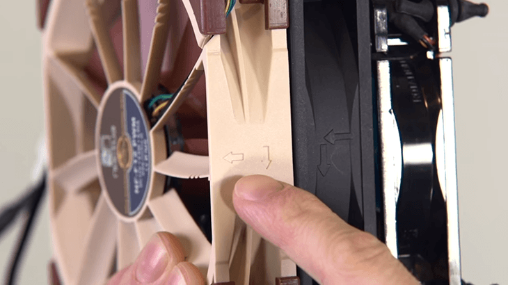 Nguyên tắc luồng gió cơ bản: quạt trước hút khí mát vào, quạt sau và quạt trên đẩy khí nóng ra. Trên mỗi quạt sẽ có mũi tên nhỏ ở cạnh viền chỉ hướng gió đi và hướng cánh quay. Nếu không thấy mũi tên thì nhớ quy tắc đơn giản: mặt có nhãn logo thường là mặt trước (hút gió vào), mặt có thanh nhựa nối khung với trục là mặt sau (đẩy gió ra).