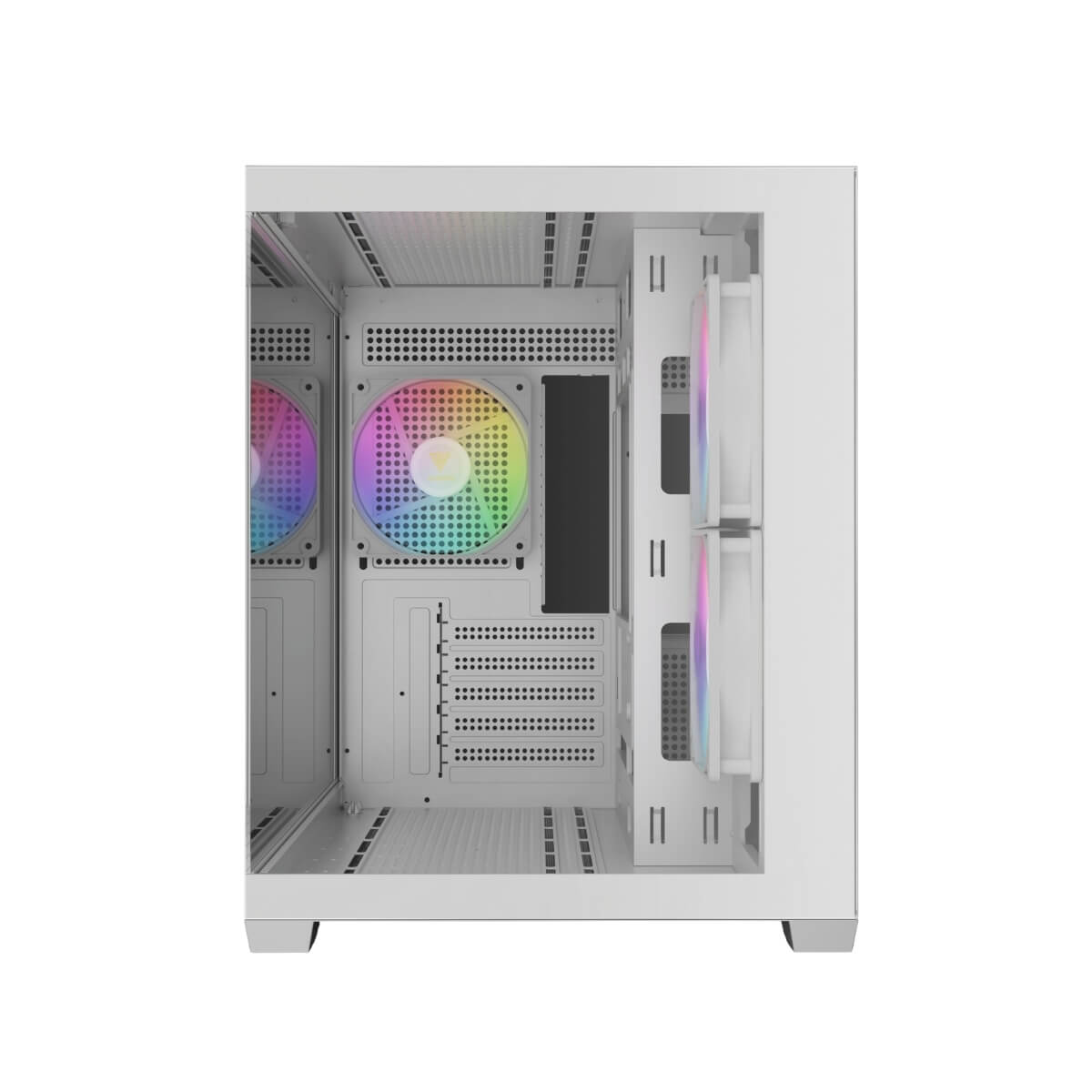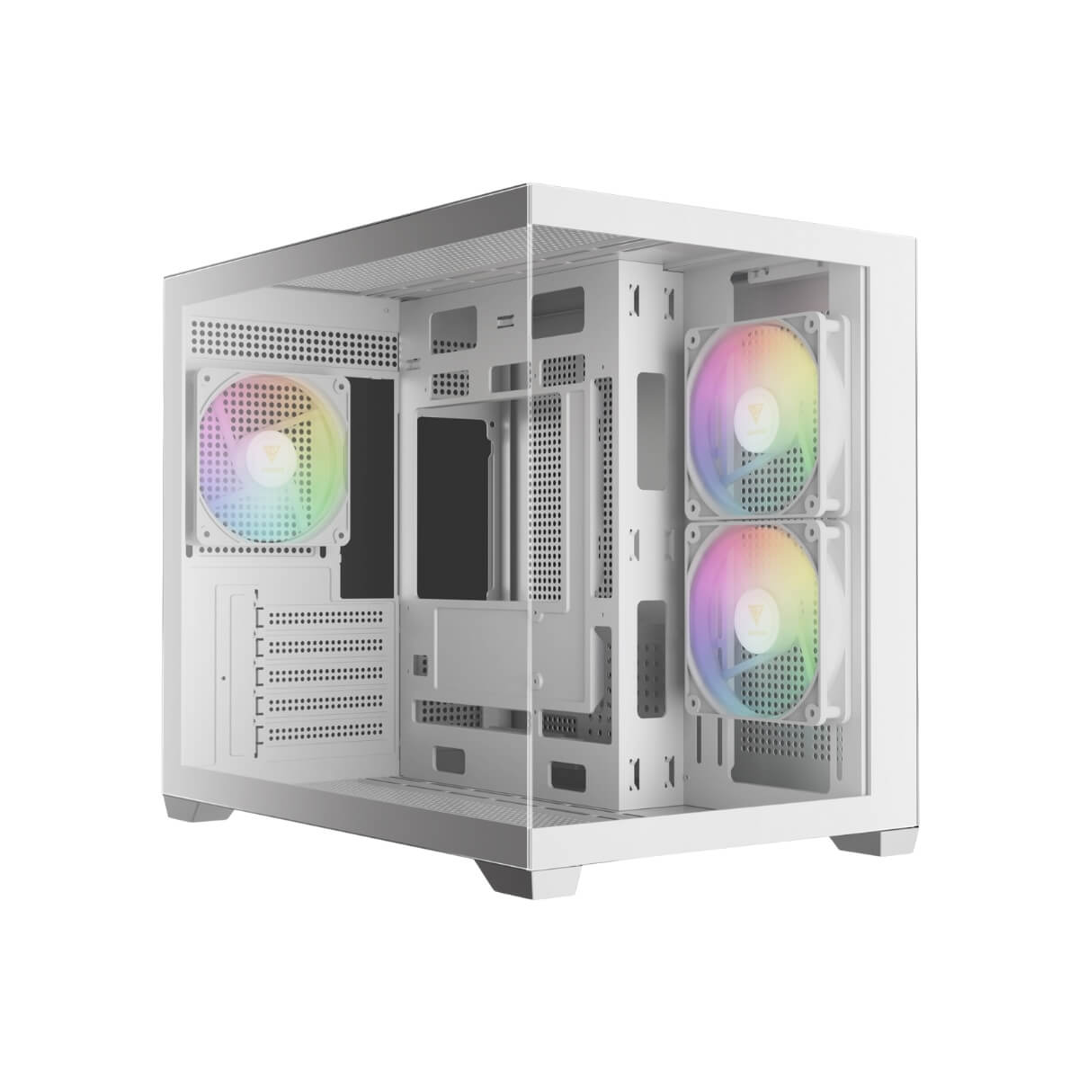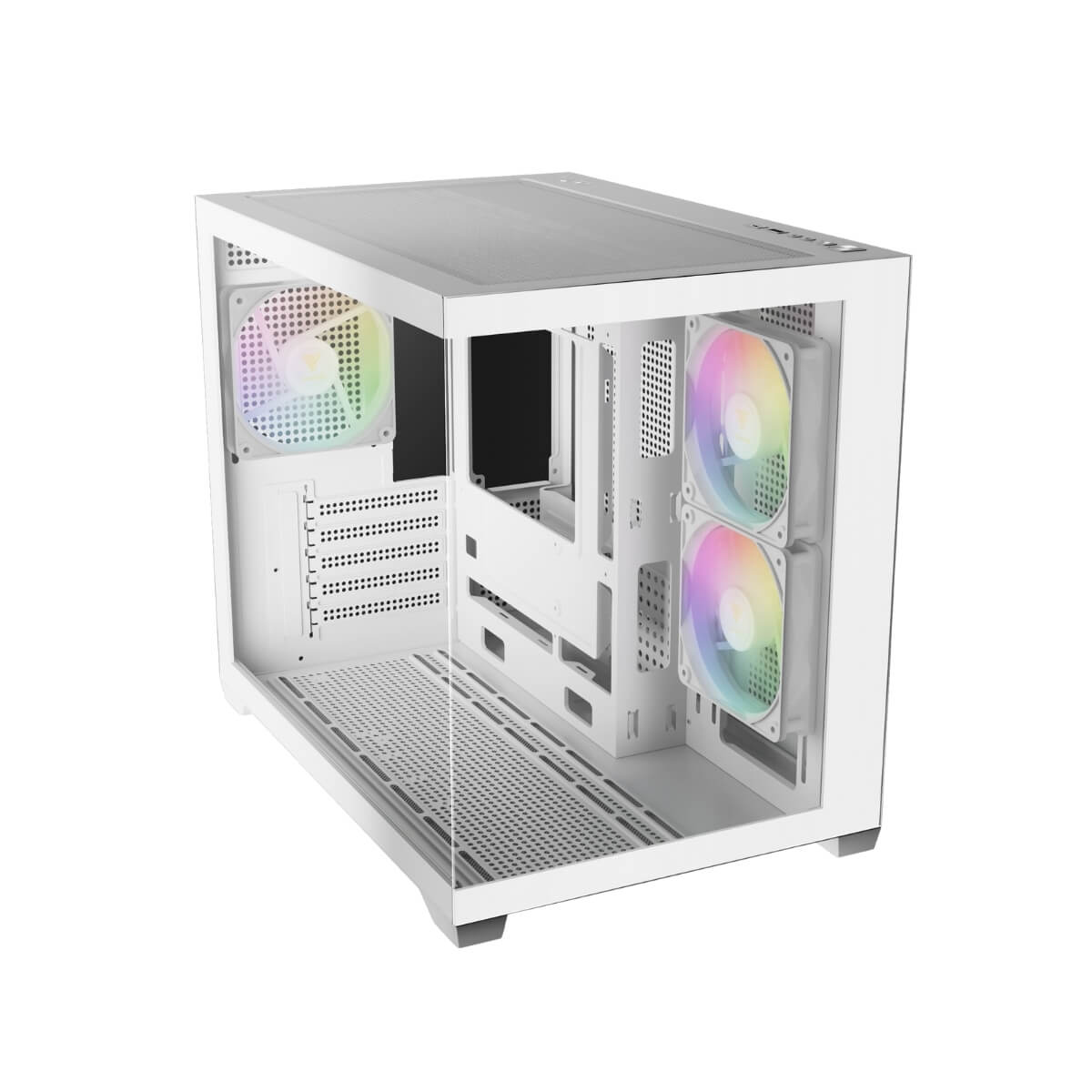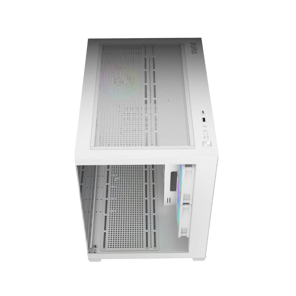 AURA GC10M V2 WH ARGB White được trang bị sẵn 3 fan ARGB, tạo nên điểm nhấn ánh sáng nổi bật bên trong khung vỏ trắng tinh tế. Hệ thống đèn có thể đồng bộ với các linh kiện ARGB khác, giúp tạo nên không gian gaming đậm chất riêng, vừa mạnh mẽ vừa hiện đại.