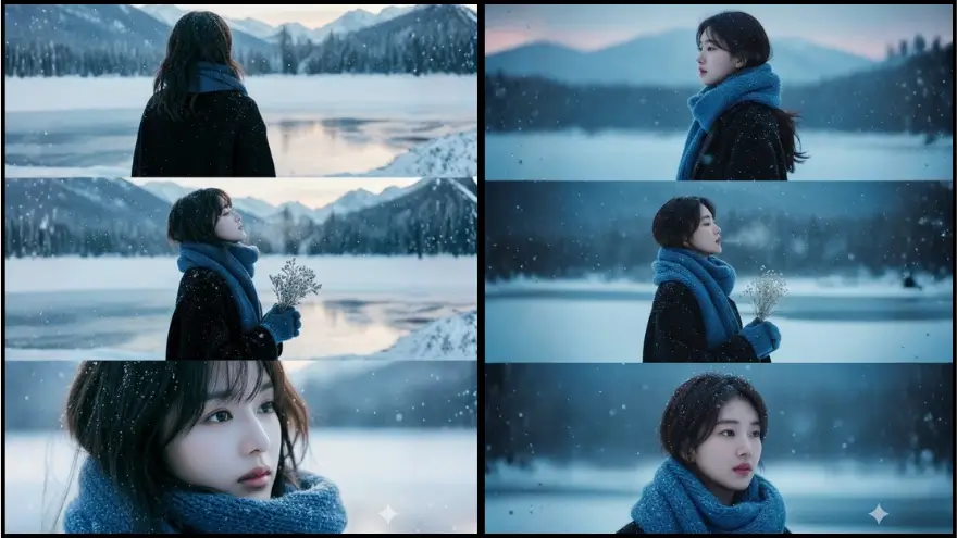 • Khung 3: Cận gương mặt — ánh sáng hoàng hôn xanh lam phản chiếu nhẹ trên khuôn mặt, tuyết bám trên khăn và tóc, ánh nhìn sâu lắng và mơ màng.