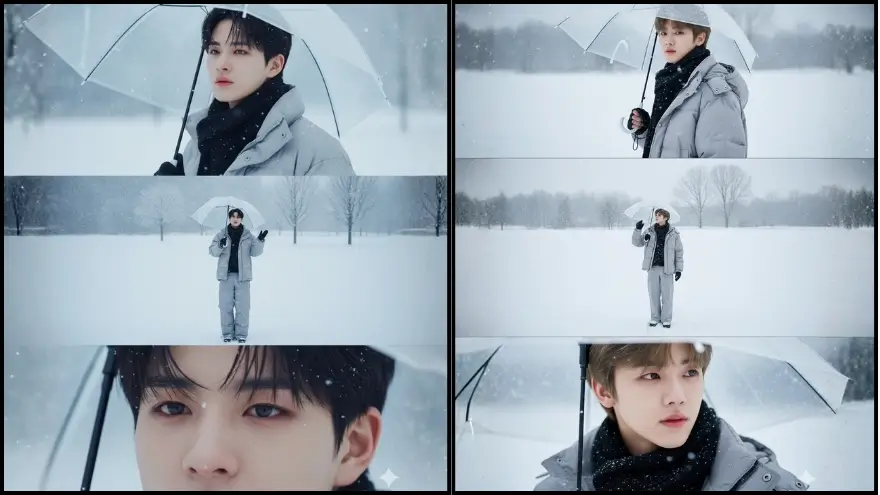 Bố cục: khung dọc 16:9, ba khung xếp chồng từ trên xuống như bộ ảnh điện ảnh liền mạch, duy trì cùng không khí tuyết rơi xuyên suốt, nhân vật chiếm khung hình nhiều hơn.”