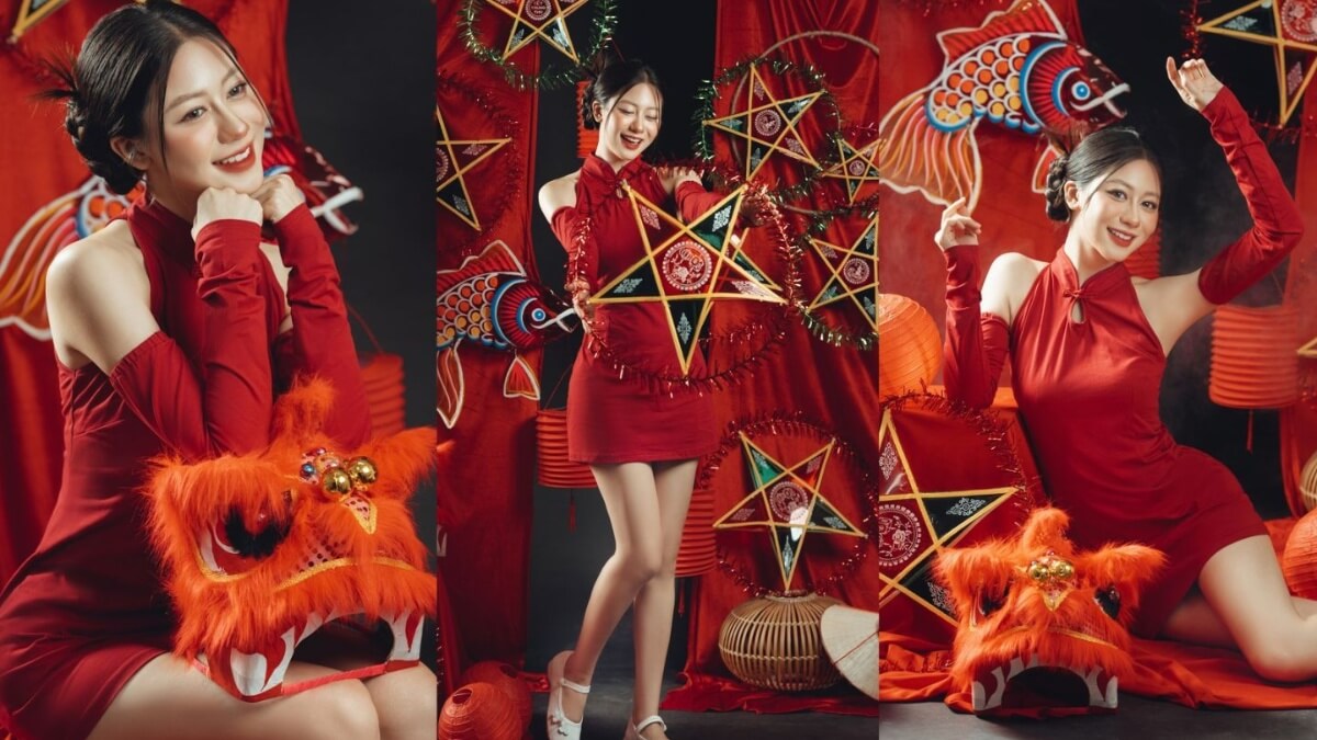 Concept cô gái trong tà áo dài đỏ đang rót trà bên bàn tre thấp. Xung quanh là đèn lồng nhiều màu và phông nền hoa lá, tạo nên không gian đậm chất hoài niệm và rất Việt Nam.