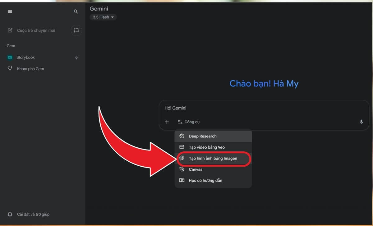 Trước tiên, bạn truy cập vào Gemini AI bằng cách mở trình duyệt trên máy tính hoặc điện thoại. Trên giao diện chính, ấn vào mục Công cụ và chọn Tạo hình ảnh bằng Imagen.