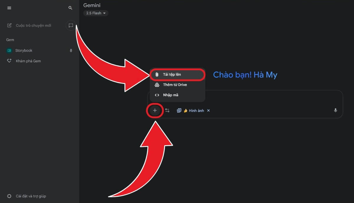 Tại giao diện trò chuyện của Gemini, hãy nhấp vào dấu cộng (+) và chọn “Tải tệp lên”.