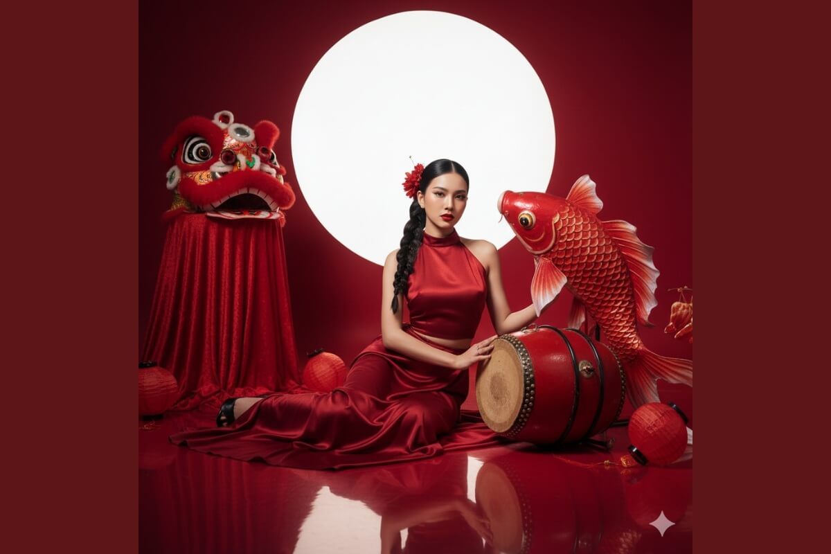 Concept cô gái trong bộ váy đỏ, tạo dáng bên đèn cá chép rực rỡ và ánh trăng khuyết ẩn hiện. Toàn cảnh được thiết kế như một bức tranh điện ảnh đậm chất thần thoại và đầy biểu cảm.