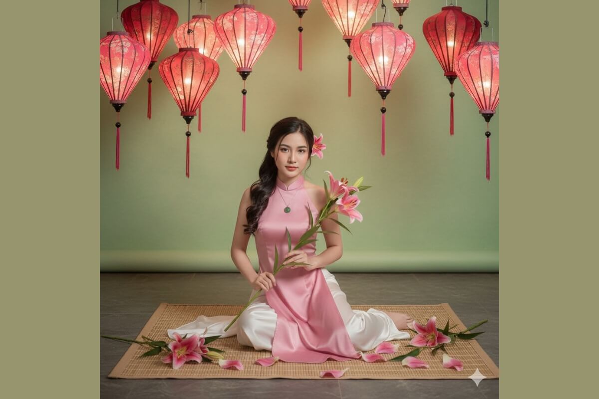 “A romantic and graceful portrait of a beautiful young Vietnamese woman, seated on a woven mat on a stone floor. She is wearing a modern, sleeveless halter-neck Áo Dài in soft pink satin with white silk pants, accessorized with a green jade necklace and a pink lily in her hair. She holds a stem of pink lilies, surrounded by more flowers on the floor. Above her, numerous glowing pink Vietnamese lanterns hang from the ceiling, creating a magical canopy of light. The background is a soft, pale green wall. Dreamlike atmosphere, soft lighting, photorealistic, high detail, 8K. Maintain 100% fidelity to the uploaded face.”