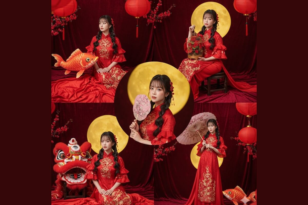 “A dynamic collage of five individual photos featuring a beautiful young Vietnamese woman in various poses, set against a rich, festive red background. She is wearing a stunning, elaborate red traditional-inspired gown with ruffled sleeves and intricate embroidery. Her long, dark hair is styled in two elegant braids adorned with small red ornaments, framing her face.