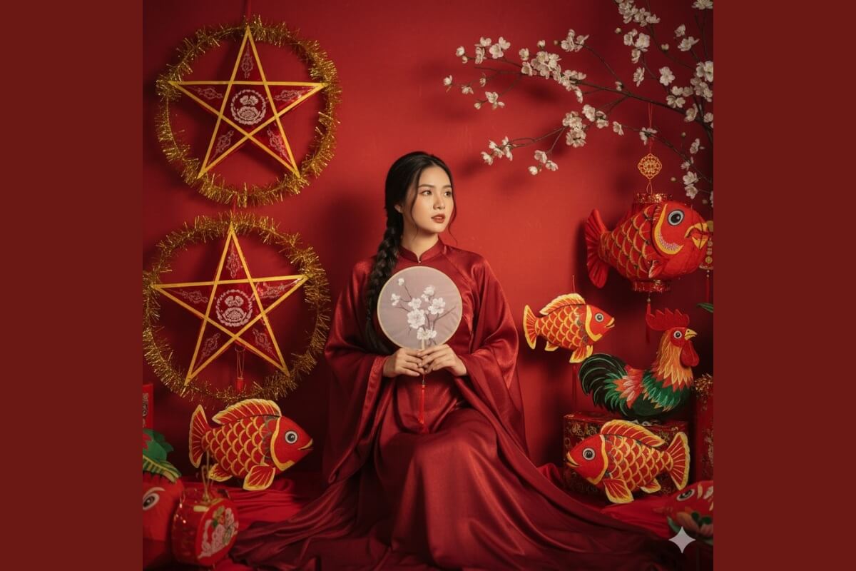 Concept người đẹp với váy đỏ truyền thống, tay cầm quạt trắng, tạo dáng giữa hàng loạt đèn lồng, đèn ông sao và đạo cụ dân gian. Hình ảnh vừa cổ điển vừa hiện đại, mang đậm bản sắc văn hóa Việt.