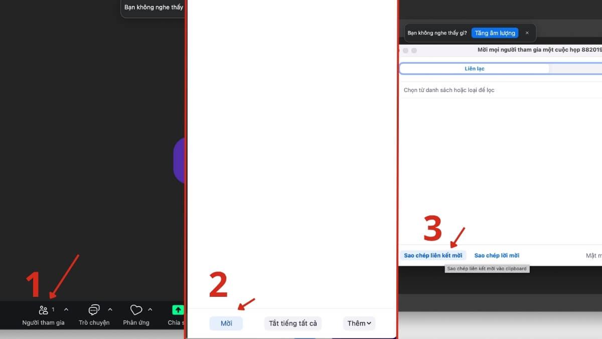Bước 3: Chọn biểu tượng “Người tham gia”, nhấn dấu cộng để sao chép link hoặc mã phòng, gửi qua email, tin nhắn hoặc ứng dụng chat
