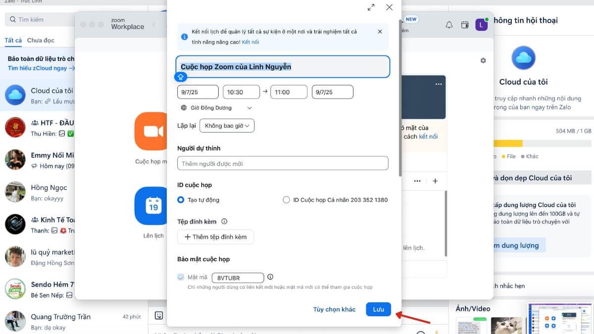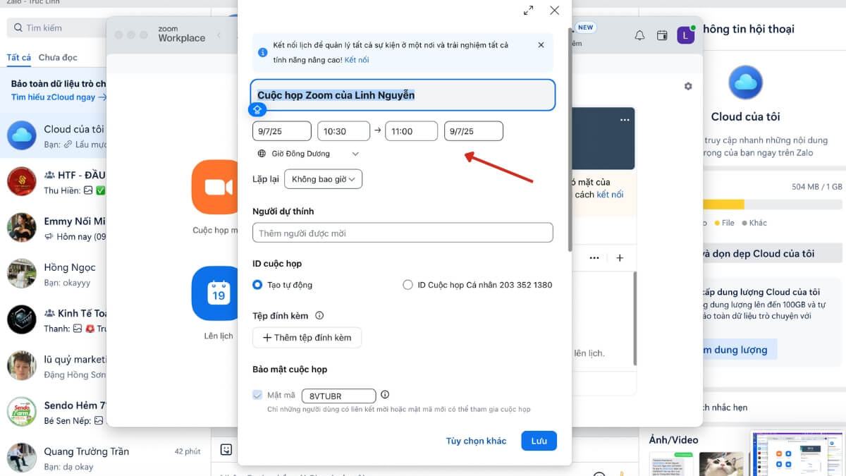 Bước 3: Nhập thông tin cuộc họp: tên, thời gian, ngày, thời lượng