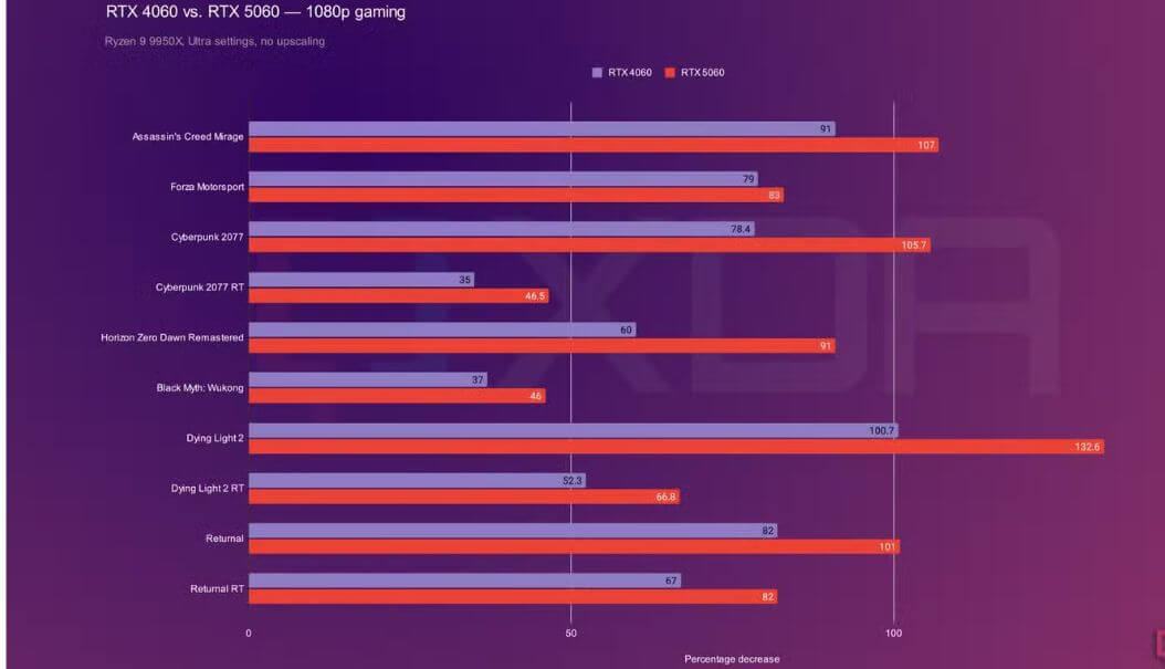 Điều này chứng tỏ RTX 5060 nhanh hơn rõ rệt, ngay cả khi không tính đến các tính năng tăng cường hiệu suất của DLSS 4 (hầu hết tính năng này có sẵn cho cả hai card, trừ MFG).