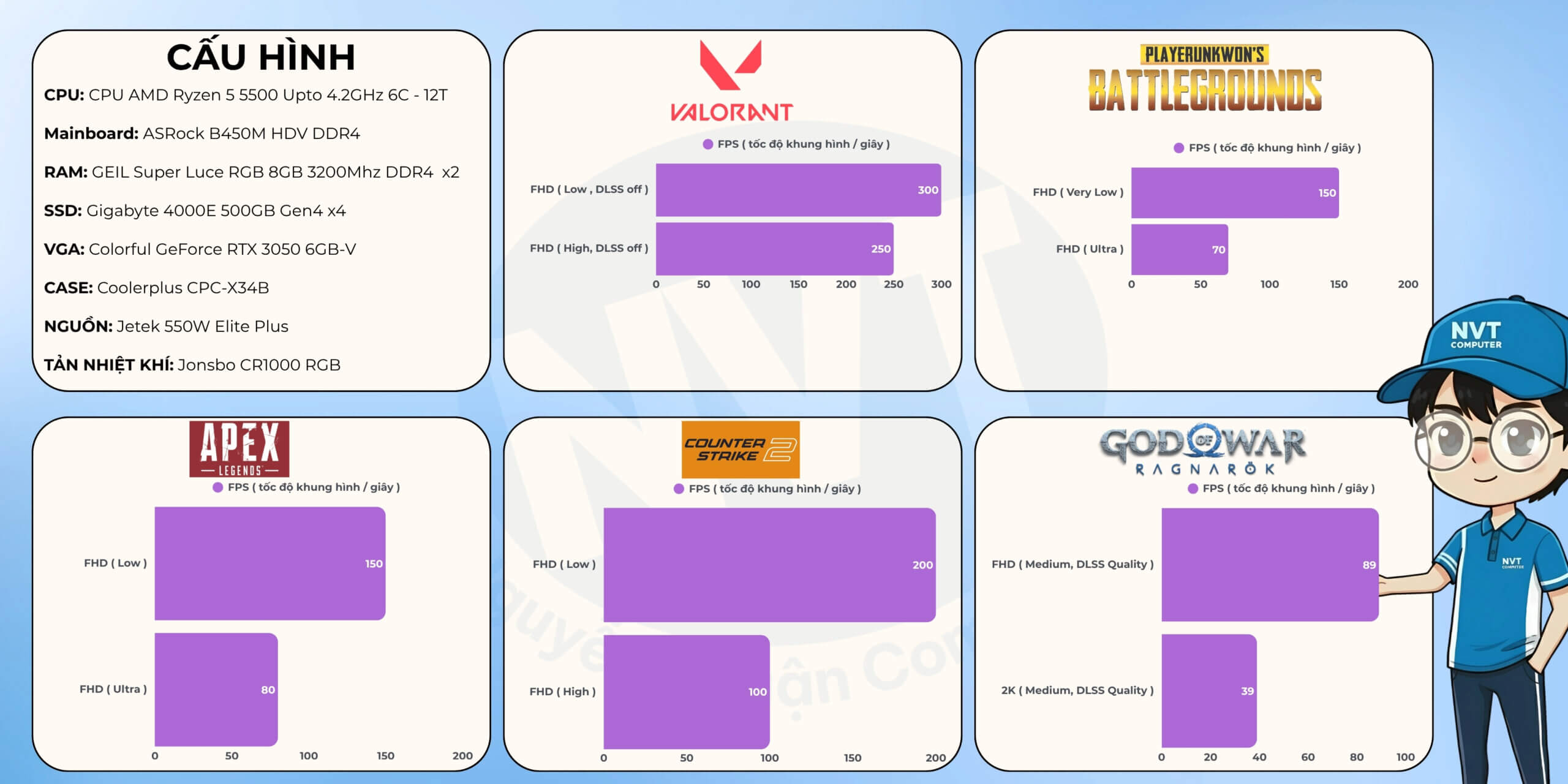 Lưu ý: Thông số FPS trên được đo trong điều kiện và cấu hình cụ thể, chỉ mang tính chất tham khảo. Hiệu năng thực tế có thể thay đổi tùy thuộc vào phiên bản game, driver, nhiệt độ và các yếu tố phần cứng/phần mềm khác.