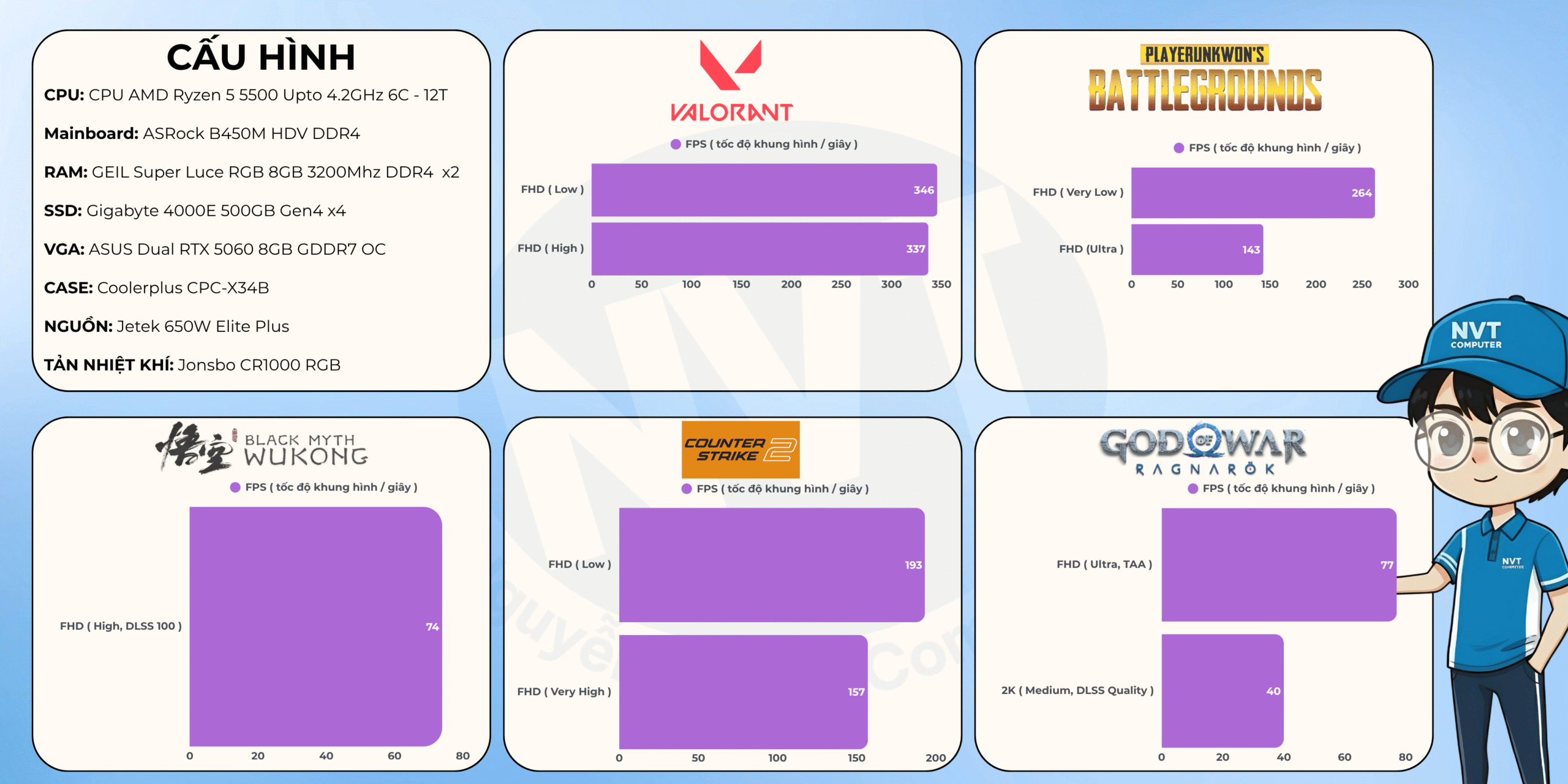Lưu ý: Thông số FPS trên được đo trong điều kiện và cấu hình cụ thể, chỉ mang tính chất tham khảo. Hiệu năng thực tế có thể thay đổi tùy thuộc vào phiên bản game, driver, nhiệt độ và các yếu tố phần cứng/phần mềm khác.