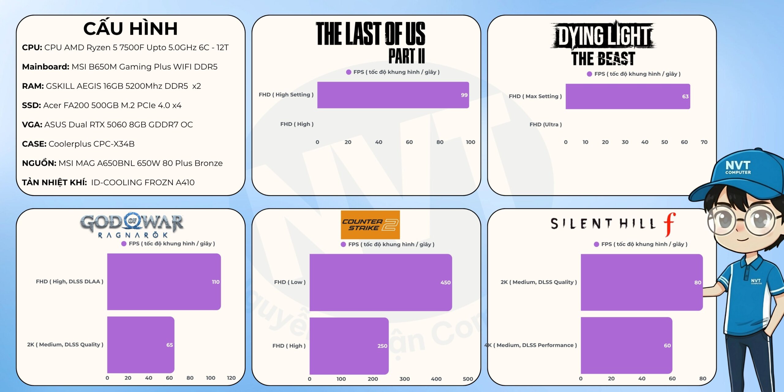 Lưu ý: Thông số FPS trên được đo trong điều kiện và cấu hình cụ thể, chỉ mang tính chất tham khảo. Hiệu năng thực tế có thể thay đổi tùy thuộc vào phiên bản game, driver, nhiệt độ và các yếu tố phần cứng/phần mềm khác.