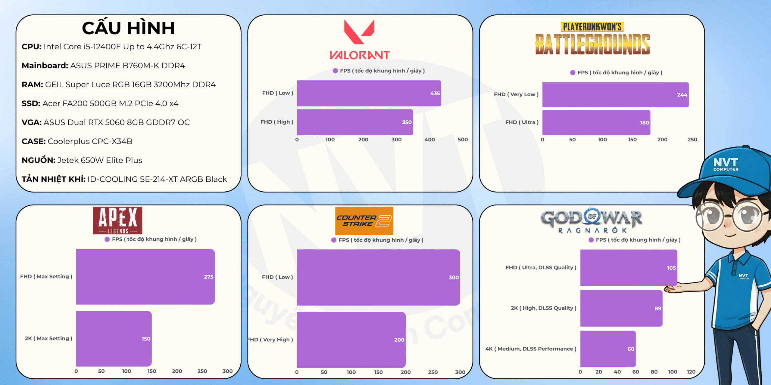 Lưu ý: Thông số FPS trên được đo trong điều kiện và cấu hình cụ thể, chỉ mang tính chất tham khảo. Hiệu năng thực tế có thể thay đổi tùy thuộc vào phiên bản game, driver, nhiệt độ và các yếu tố phần cứng/phần mềm khác.