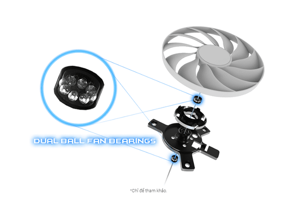 Tuổi thọ của quạt trên card màn hình ASUS Dual GeForce RTX 4060 được nâng cao nhờ vào vòng bi quạt kép. Điều này giúp tăng cường độ bền, mang đến sự yên tâm cho người sử dụng.