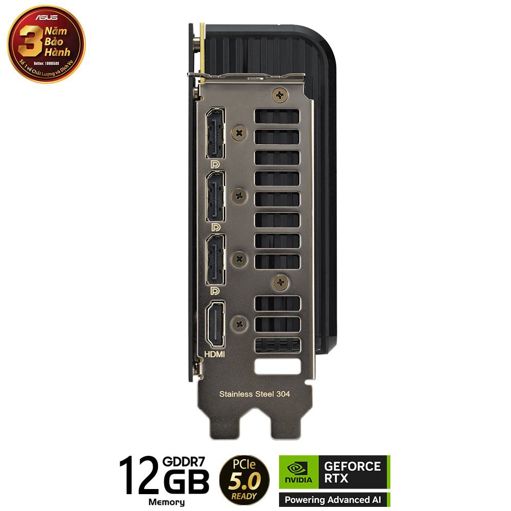 Với thiết kế 2.5 khe cắm và kích thước 304 x 126 x 50 mm, ASUS Prime RTX 5070 tương thích với nhiều loại vỏ máy tính, kể cả các hệ thống nhỏ gọn (SFF-Ready). Card hỗ trợ chuẩn PCI Express 5.0, tận dụng tối đa băng thông của các bo mạch chủ thế hệ mới. Về kết nối, sản phẩm được trang bị 1 cổng HDMI 2.1b và 3 cổng DisplayPort 2.1b, hỗ trợ độ phân giải tối đa 7680 x 4320 và khả năng kết nối đồng thời 4 màn hình, đáp ứng nhu cầu đa nhiệm hoặc trải nghiệm chơi game đa màn hình. Nguồn khuyến nghị 750W cùng đầu nối nguồn 1 x 16-pin đảm bảo cung cấp năng lượng ổn định cho hiệu suất tối ưu.