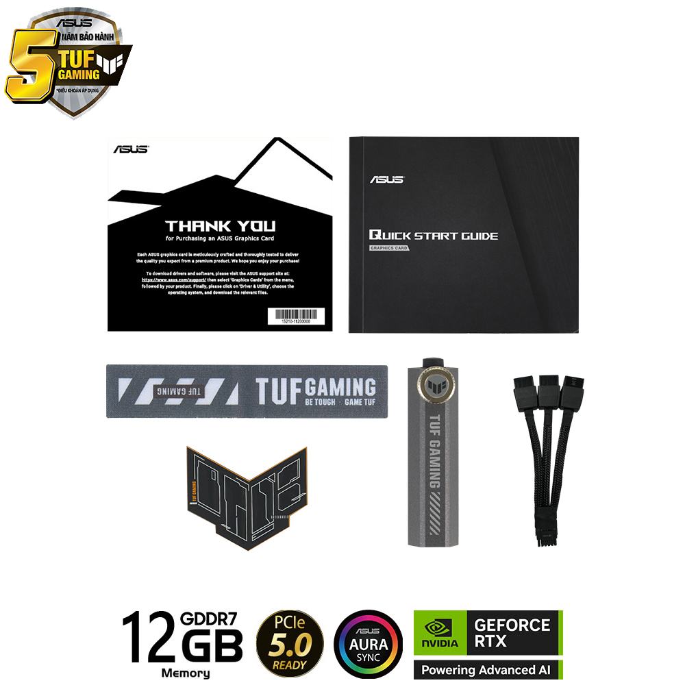 ASUS TUF Gaming RTX 5070 được tích hợp phần mềm GPU Tweak III, cho phép người dùng tùy chỉnh hiệu suất, theo dõi hệ thống và điều chỉnh tốc độ quạt một cách trực quan. Sản phẩm cũng hỗ trợ MuseTree và trình điều khiển GeForce Game Ready, đảm bảo trải nghiệm chơi game luôn được cập nhật và tối ưu. Trong hộp sản phẩm, ASUS cung cấp các phụ kiện tiện ích như TUF Graphics Card Holder, Velcro Hook & Loop, TUF Magnet, TUF Gaming Certificate, Thank You Card, hướng dẫn cài đặt nhanh và cáp chuyển đổi nguồn (1 sang 2), mang lại sự hỗ trợ toàn diện cho người dùng.